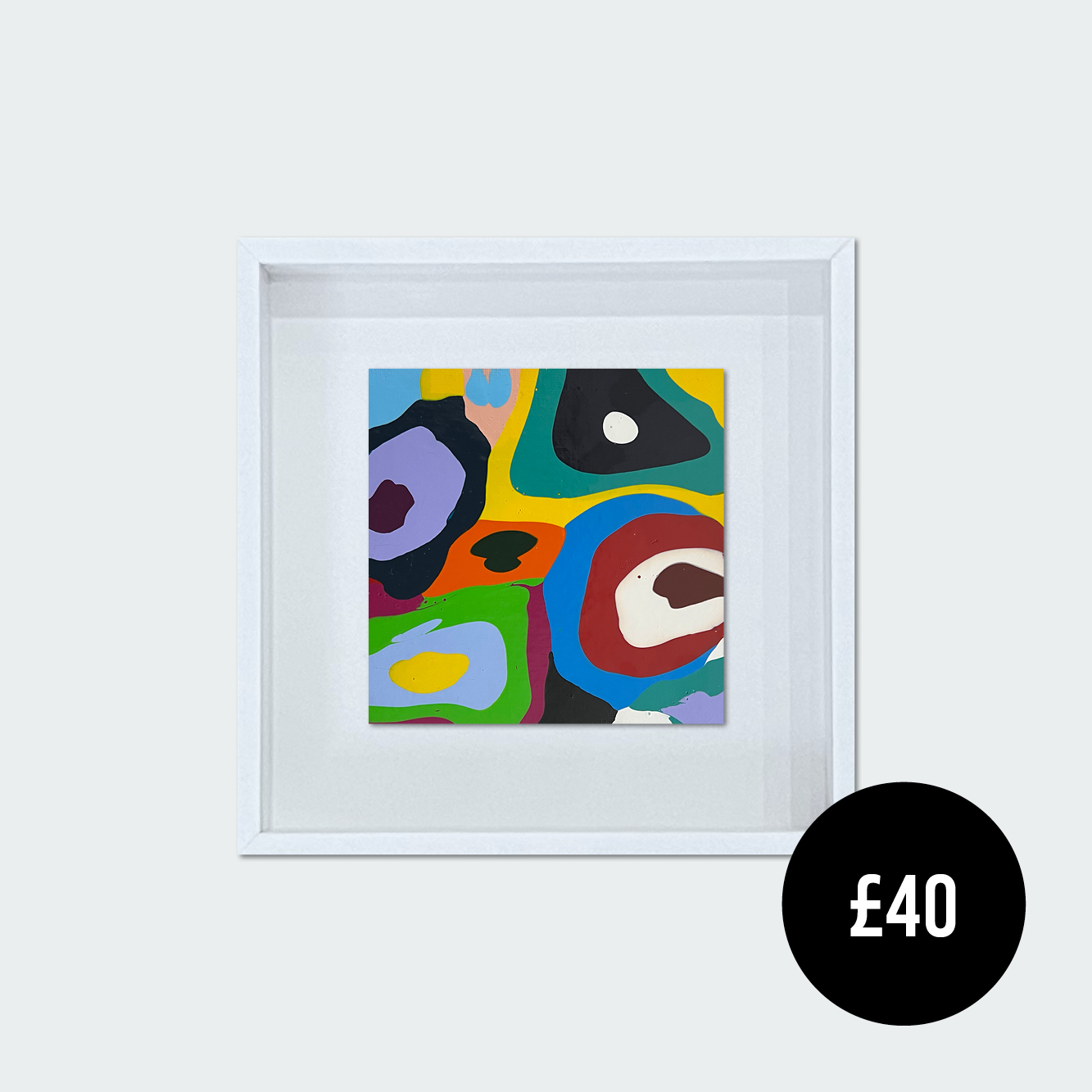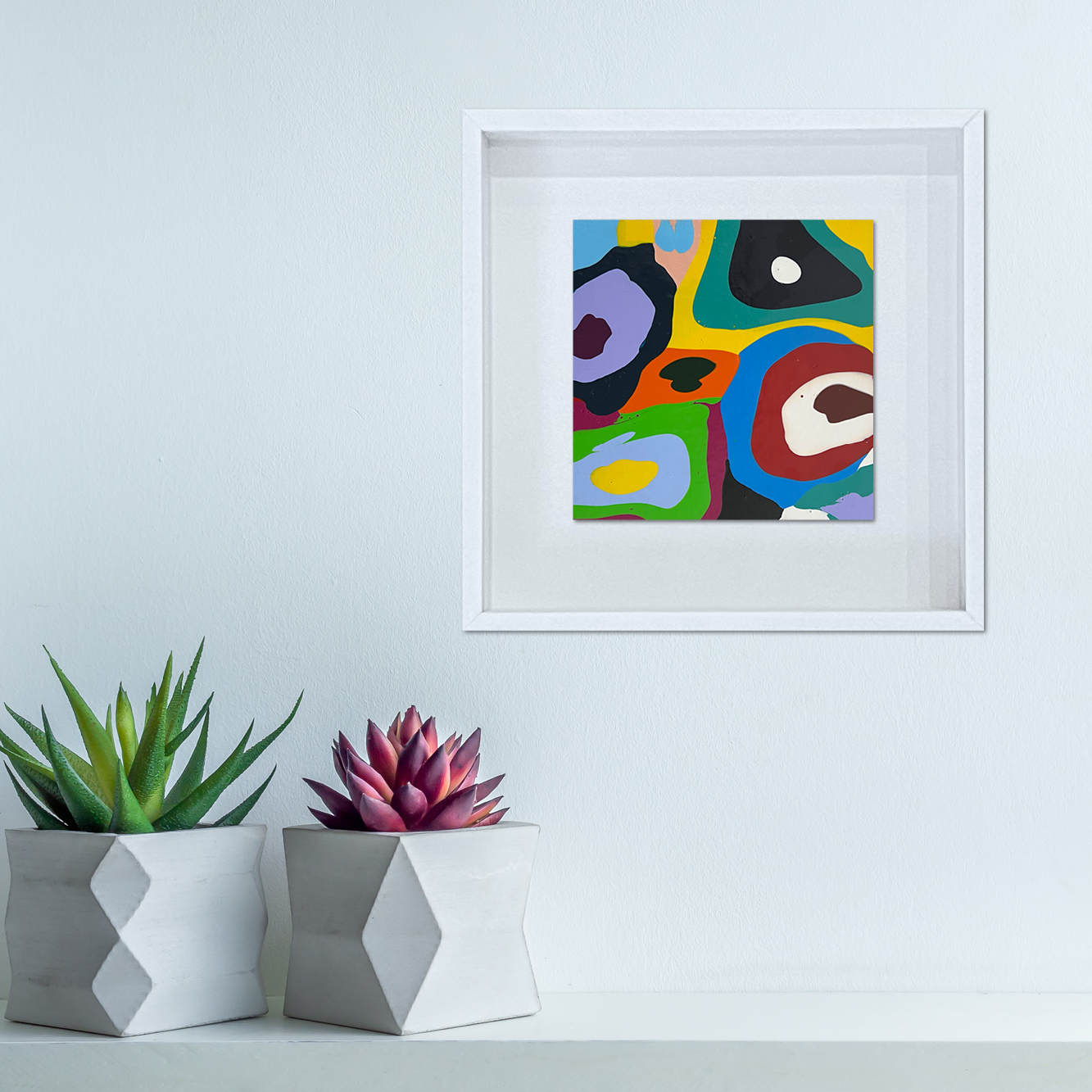 The bright colours make me think of all my favourite sweets! Created using acrylic pouring paints on canvas and framed in a 45mm deep 275mm square wooden frame.