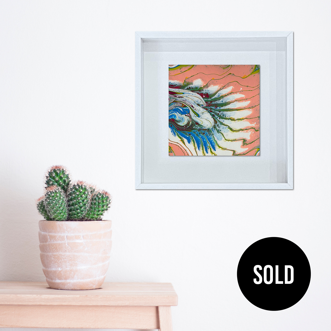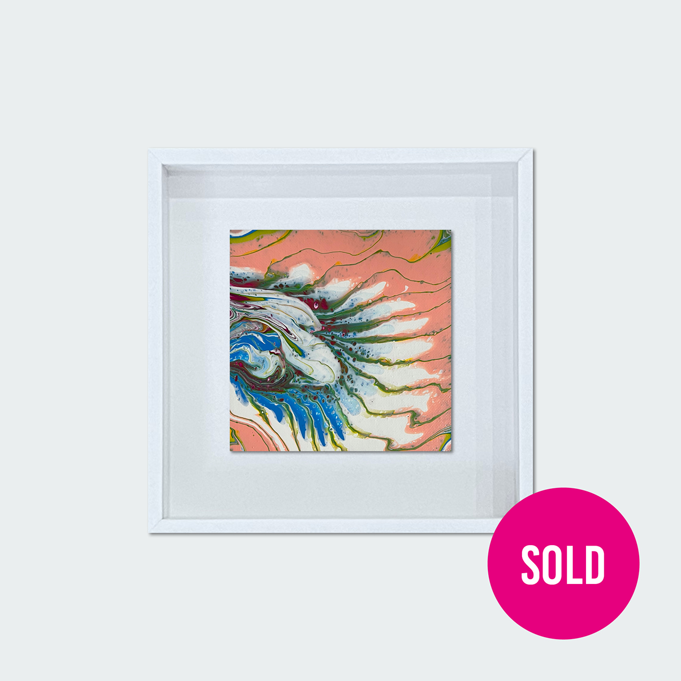 The colours and shapes remind me of the feathers on a birds wing. Created using acrylic pouring paints on canvas and framed in a 45mm deep 275mm square wooden frame.
